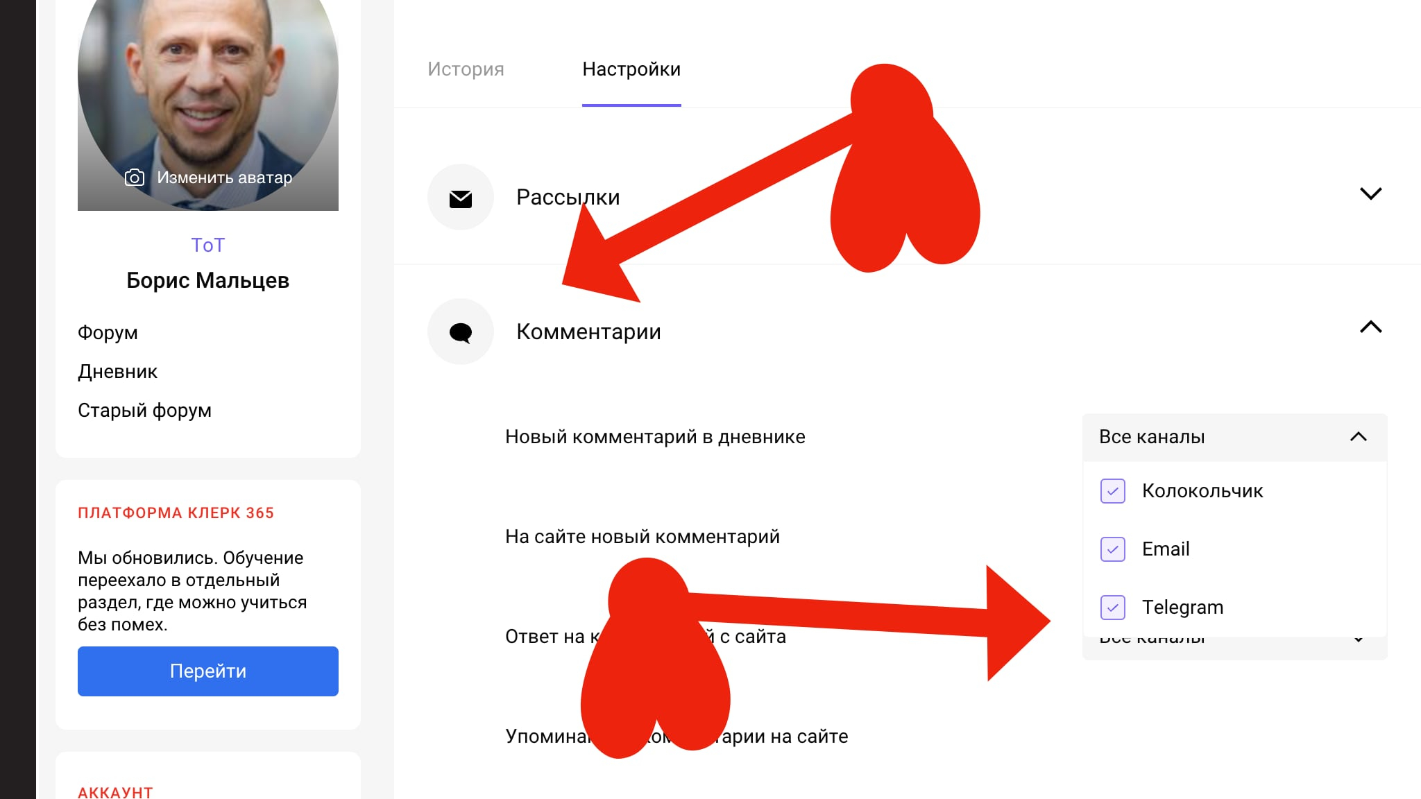 Обязательно проверьте включены ли у вас уведомления на этой странице профиля на «Клерке».
