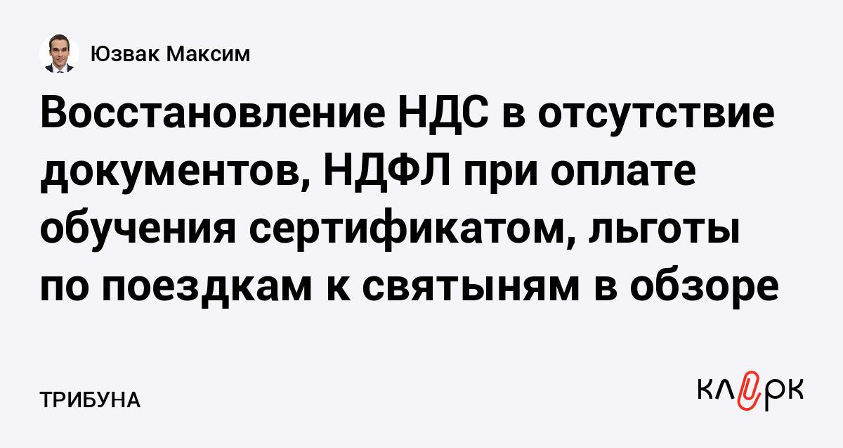 Восстановление НДС в отсутствие документов, НДФЛ при оплате обучения сертификатом, льготы по поездкам к святыням в обзоре